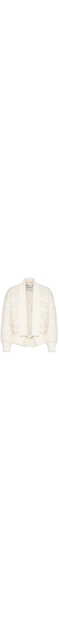 A jaqueta branca é confeccionada em nylon sem elasticidade. A peça solta ao corpo possui lapela reta, mangas longas com ajuste nos punhos, detalhe em ribana na lapela, punhos e barra, forro, superfície em matelassê, cordões embutidos na parte frontal para ajuste frontal nas barras e não possui fechamento.