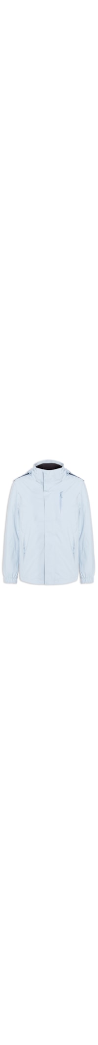 A jaqueta azul é confeccionada em tecido encorpado sem elasticidade. A peça de solta ao corpo possui gola alta com capuz removível embutido, mangas longas com ajuste nos punhos e tira aplicada com velcro para ajustes, recortes frontais e posteriores, bolsos frontais com fechamento por zíper, bolso frontal na altura do tórax com fechamento por zíper e fechamento frontal por zíper e botões de pressão. Acompanha segunda jaqueta preta de modelo puffer* com gola alta, bolsos laterais com fechamento por zíper invisível e fechamento frontal por zíper.