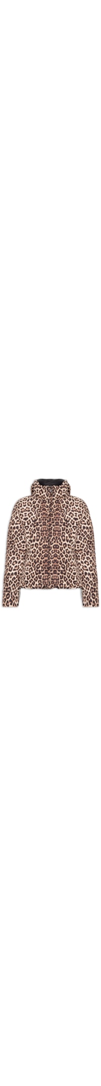 A jaqueta marrom é confeccionada em tactel sem elasticidade. A peça de modelo dupla face solta ao corpo possui capuz removível, mangas longas, dupla face animal print, forro com enchimento, superfície em matelassê, bolsos frontais embutidos e fechamento frontal por zíper.