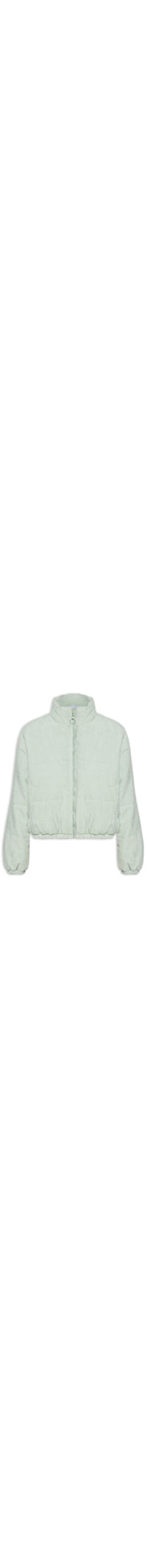 A jaqueta verde é confeccionada por veludo cotelê sem elasticidade. A peça solta ao corpo possui gola alta, mangas longas com elástico embutido nos punhos, ombros estendidos bolsos frontais no modelo faca, elástico embutido na barra, forro acolchoado e fechamento por zíper frontal.