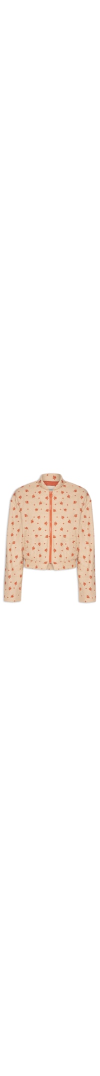 A jaqueta bege é confeccionada em tecido encorpado com toque de linho sem elasticidade. A peça solta ao corpo possui gola alta, ombros estendidos, mangas longas, bolsos frontais embutidos, elástico embutido na barra, padronagem floral em cor contrastante, forro com leve enchimento, comprimento cropped* e fechamento frontal por zíper.
