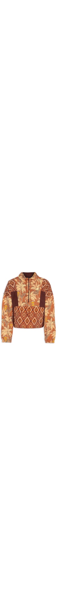 A jaqueta marrom é confeccionada em tactel sem elasticidade. A peça solta ao corpo possui capuz com cordão embutido para ajuste, mangas longas com ajuste nos punhos, ombros estendidos, recortes e mangas coim mix de estampas com cores contrastantes, nome e logo da marca bordado na cor amarelo na altura do busto, bolso frontal com fechamento por aba e velcro, cordão embutido na barra para ajuste posterior interno, comprimento cropped* e fechamento frontal por zíper.