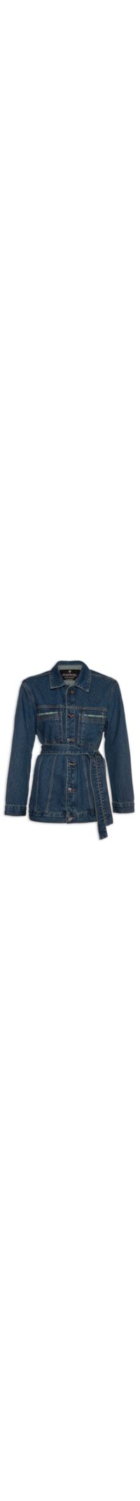 A jaqueta azul é confeccionada em sarja com lavagem jeans. A peça possui colarinho assimétrico, mangas longas com abotoamento nos punhos, recortes frontais e posteriores, bolsos frontais aplicados na altura do busto com detalhes de franzidos, tag metalizada da marca aplicado na parte posterior, passantes fixos aplicados na altura da cintura, bolsos frontais embutidos, comprimento alongado, shape solto e fechamento frontal por botões metalizados. Acompanha faixa na mesma cor e tecido para uso opcional.