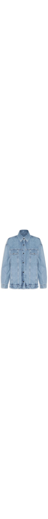 A jaqueta azul é confeccionada em sarja com lavagem jeans sem elasticidade. A peça solta ao corpo possui colarinho clássico, mangas longas com ajuste nos punhos, bolsos frontais embutidos, bolsos decorativos aplicados na parte frontal, recortes frontais e posteriores, tag da marca metalizada aplicada na parte posterior, efeito estonado e fechamento frontal por botões.