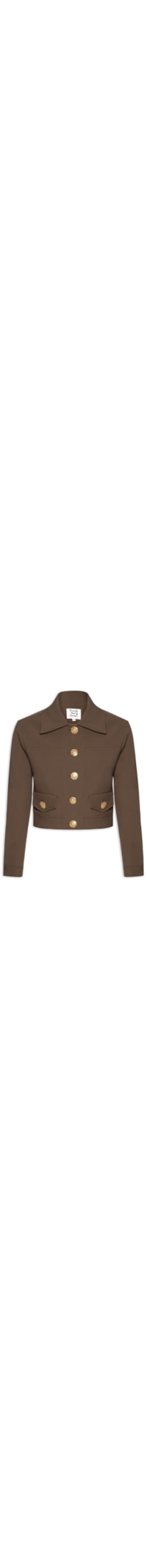 A jaqueta marrom é confeccionada em tecido leve sem elasticidade. A peça solta ao corpo possui gola simples, ombros estendidos, mangas longas com abotoamento nos punhos, recorte frontal e posterior, bolsos frontais decorativos com aba sobreposta, forro e fechamento frontal em botões.