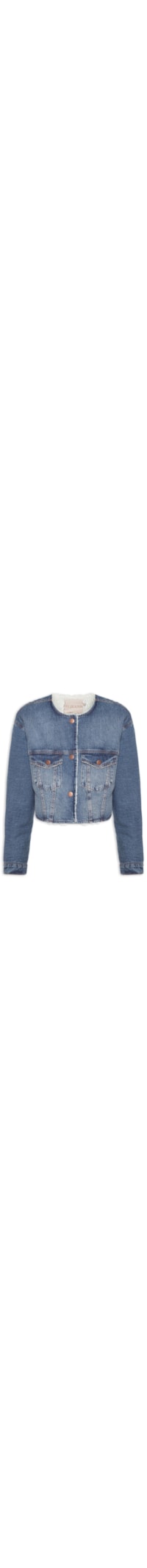 A jaqueta azul é confeccionada em sarja com lavagem jeans sem elasticidade. A peça solta ao corpo possui decote arredondado, mangas longas com abotoamento nos punhos, bolsos frontais com aba sobreposta e fechamento por botão, recortes, barra com acabamento em corte a fio, forro interno peluciado, comprimento cropped* e fechamento frontal por botões de pressão.