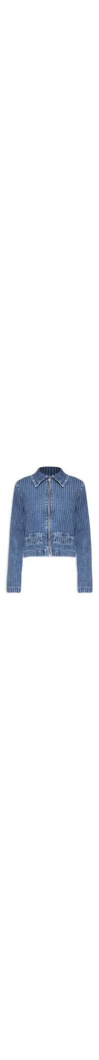 A jaqueta azul é confeccionada em sarja com superfície canelada e baixa elasticidade. A peça solta ao corpo possui colarinho clássico, mangas longas, bolsos frontais, tag da marca aplicada na parte posterior em tom contrastante e fechamento frontal em zíper.