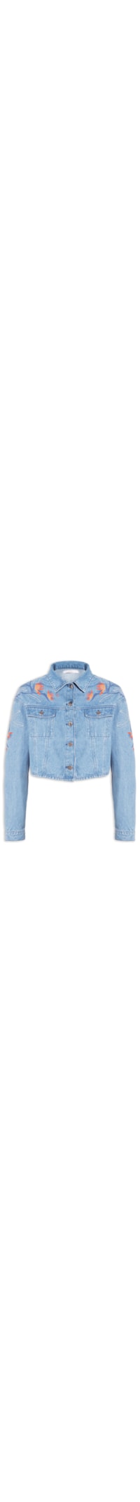 A jaqueta azul é confeccionada em sarja com lavagem jeans sem elasticidade. A peça solta ao corpo possui colarinho clássico, mangas longas com abotoamento nos punhos, bolsos frontais decorativos com aba sobreposta e botão, recortes frontais e posteriores, tag metalizada da marca aplicada na parte posterior, bordados figurativos florais em cor contrastante, comprimento cropped* e fechamento frontal por botões.