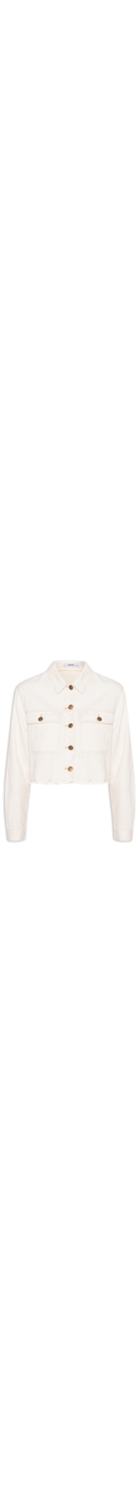 A jaqueta off white é confeccionada em sarja sem elasticidade. A peça solta ao corpo possui colarinho clássico, mangas longas com abotoamento nos punhos, bolsos frontais com fechamento por aba sobreposta e botão, recortes nas partes frontal e posterior, barra cortada a fio, comprimento cropped* e fechamento frontal por botões.