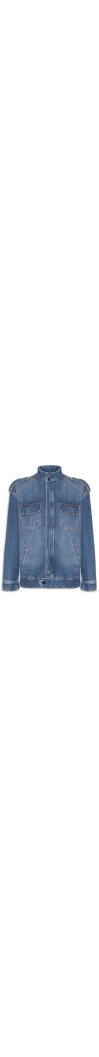 A jaqueta azul é confeccionada em sarja com lavagem jeans e sem elasticidade. A peça solta ao corpo possui gola alta, ombros estendidos com aplicação de martingale, mangas longas com abotoamento nos punhos, bolsos frontais com fechamento por aba sobreposta e botões de pressão na altura do busto, bolsos frontais embutidos, recorte posterior com aplicação de tag metálica da marca, efeito estonado e fechamento frontal por zíper com aba sobreposta.