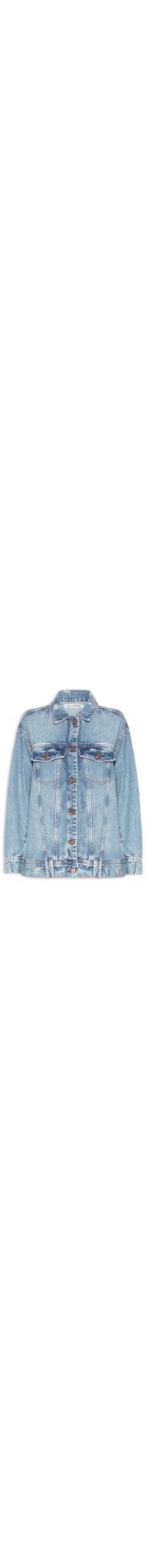 A jaqueta azul é confeccionada em sarja com lavagem jeans sem elasticidade. A peça solta ao corpo possui colarinho clássico, mangas longas com abotoamento nos punhos, ombros estendidos, bolsos frontais decorativos com detalhe de puídos, recortes frontais e posteriores, efeito estonado e fechamento frontal por botões.