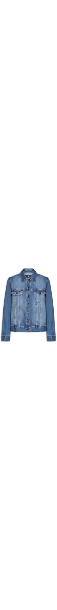 A jaqueta azul é confeccionada em sarja com lavagem jeans sem elasticidade. A peça solta ao corpo possui colarinho clássico, mangas longas com abotoamento nos punhos, recortes frontais e posteriores com pespontos contrastantes, dois bolsos frontais com aba sobreposta e fechamento por botão, efeito estonado e fechamento frontal por botões.