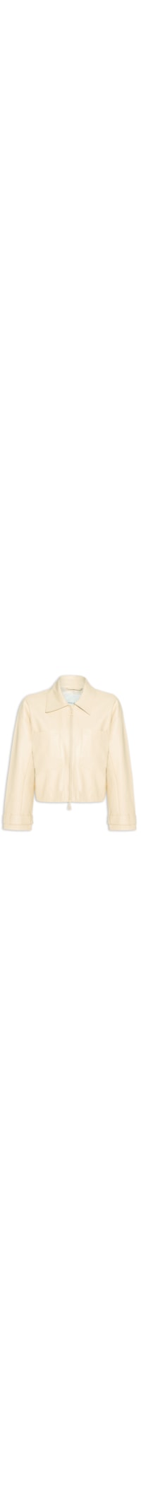 A jaqueta bege é confeccionada em material sintético sem elasticidade. A peça solta ao corpo possui colarinho clássico, ombros estendidos, mangas longas com passantes e faixa com fechamento por botão aplicados nos punhos, dois bolsos frontais, recortes na parte posterior, comprimento *cropped, e fechamento frontal por zíper.