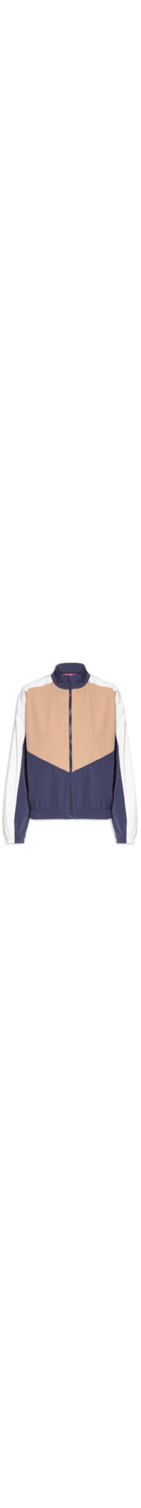 A jaqueta azul é confeccionada em tecido leve com sem elasticidade. A peça possui gola alta, mangas longas com punhos ajustados por elástico, ombros levemente deslocados, bolsos frontais embutidos, caimento reto, recortes frontais e posteriores em cor contrastante, barra com elástico embutido e fechamento frontal por zíper.