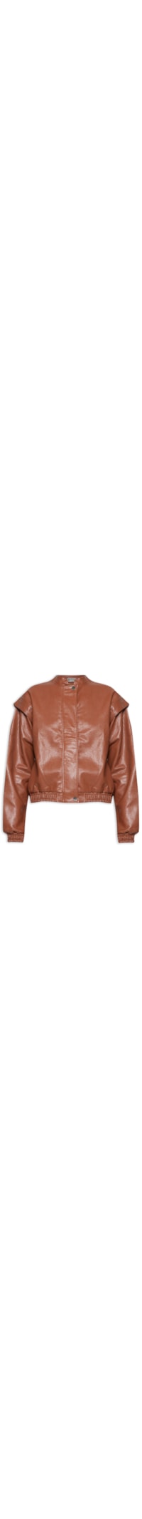 A jaqueta marrom é confeccionada em material sintético sem elasticidade. A peça solta ao corpo, possui decote redondo com tag da marca metálica aplicada na parte posterior, mangas longas com elástico embutido nos punhos, recorte sobreposto nos ombros, recorte posterior, elástico embutido na barra, comprimento cropped*, forro e fechamento frontal por zíper metálico e botões de pressão.