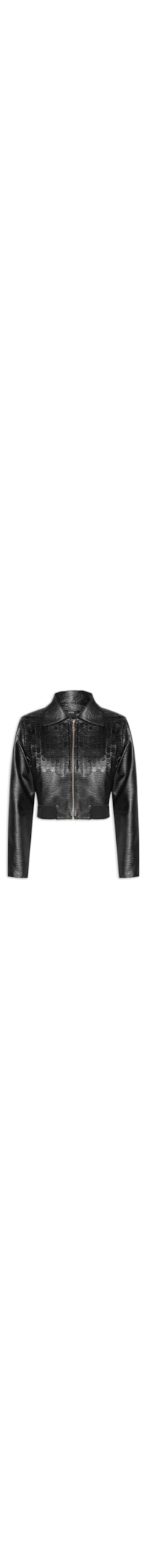 A jaqueta preta é confeccionada em material sintético sem elasticidade. A peça solta ao corpo possui colarinho simples, mangas longas, superfície texturizada na parte frontal, forro, comprimento cropped* e fechamento frontal por zíper.