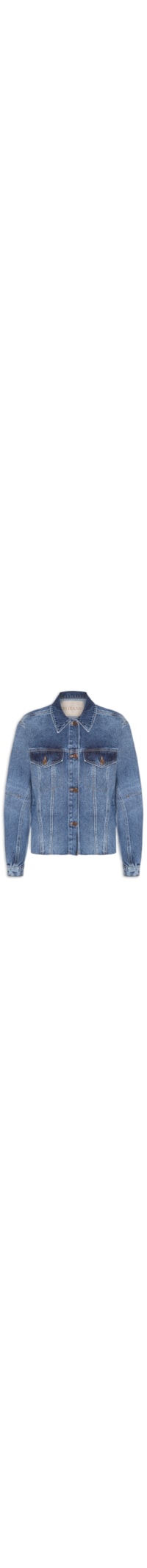 A jaqueta azul é confeccionada em sarja com lavagem jeans sem elasticidade. A peça solta ao corpo possui colarinho clássico, mangas longas com punho com botão aplicado, bolsos frontais decorativos, recortes frontais e posteriores, tiras médias com botões aplicadas na parte posterior, efeito estonado, barra com efeito em corte a fio e fechamento frontal por botões.