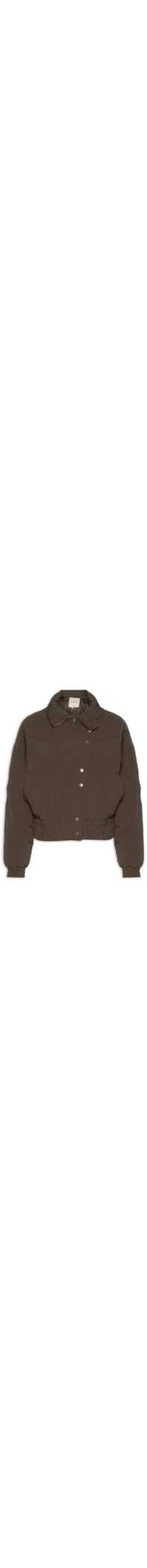 A jaqueta marrom é confeccionada em nylon. A peça solta ao corpo possui gola alta, mangas longas com ajuste nos punhos, bolsos frontais embutidos, recortes frontais e posteriores, elástico embutido na barra, acabamento pespontado e fechamento frontal por zíper e botões.