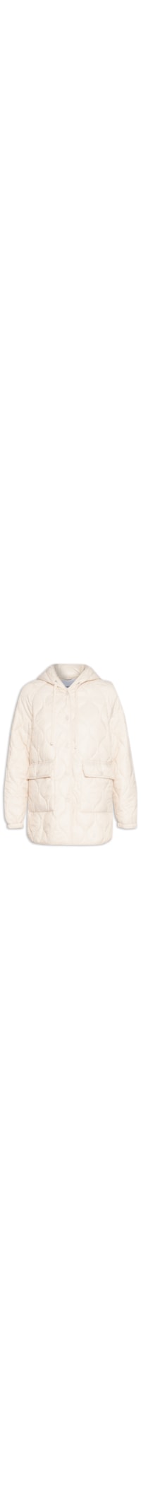 A jaqueta bege é confeccionada em nylon sem elasticidade. A peça solta ao corpo possui capuz com cordão embutido, mangas longas modelo raglan com ajuste nos punhos, bolsos frontais modelo cargo com fechamento por aba e botão de pressão, superfície em matelassê e fechamento frontal por botões de pressão.