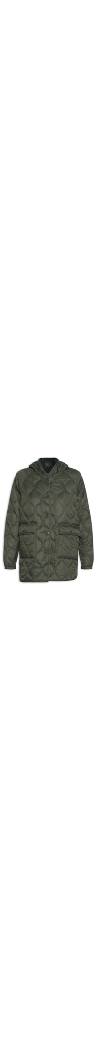 A jaqueta verde é confeccionada em nylon sem elasticidade. A peça solta ao corpo possui capuz com cordão embutido, mangas longas modelo raglan com ajuste nos punhos, bolsos frontais modelo cargo com fechamento por aba e botão de pressão, forro, superfície em matelassê e fechamento frontal por botões de pressão.