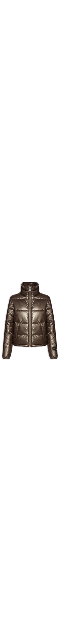 A jaqueta marrom é confeccionadaem matelassê sem elasticidade. A peça solta ao corpo de modelo puffer* possui gola alta, mangas longas, tag da marca emborrachada aplicada no punho, dois bolsos frontais embutidos, forro, elástico embutido na barra para ajuste e fechamento frontal por zíper.