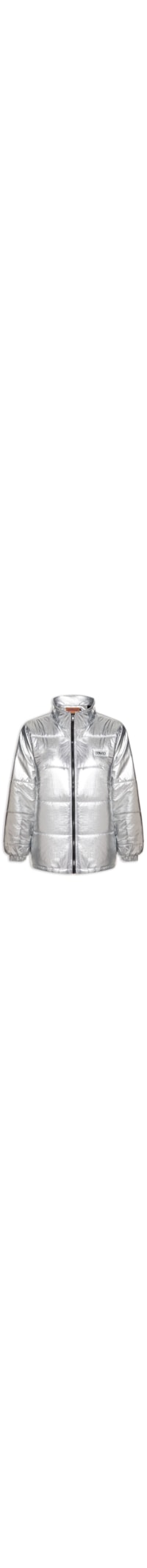 A jaqueta prata é confeccionada em tecido leve com superfície metalizada. A peça de modelo puffer* possui gola alta, ombros levemente estendidos, mangas longas com faixas elásticas embutidas nos punhos, tag emborrachada da marca aplicada na altura do busto, forro, shape solto, caimento reto, acabamento pespontado e fechamento frontal por zíper.