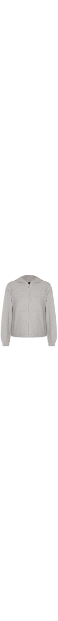 A jaqueta cinza é confeccionada em moletinho. A peça possui capuz aplicado, ombros estendidos, mangas longas com elástico embutido nos punhos, bolsos frontais embutidos, shape solto e fechamento frontal por zíper.