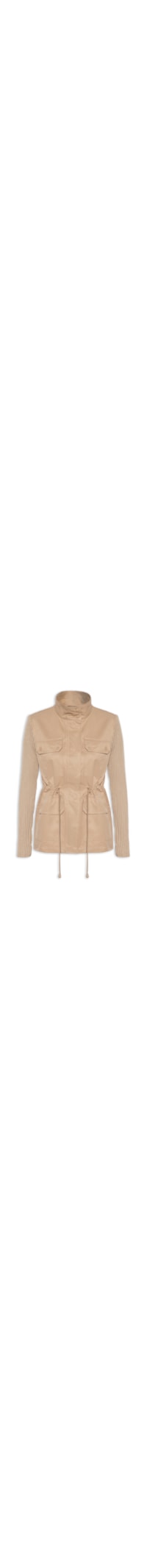 A jaqueta marrom é confeccionada em sarja sem elasticidade. A peça solta ao corpo possui colarinho clássico, mangas longas em tricot com superfície texturizada, cordão embutido na altura da cintura para ajuste frontal, bolsos frontais com fechamento por aba e botão de pressão e fechamento frontal por zíper e botões de pressão.