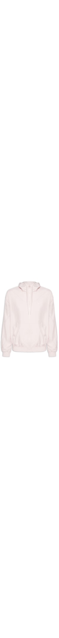 A jaqueta rosa é confeccionada em tactel sem elasticidade. A peça solta ao corpo possui gola alta com capuz com cordão embutido para ajuste, mangas longas com elástico embutido nos punhos, bolsos frontais, elástico embutido na barra e fechamento frontal por zíper.