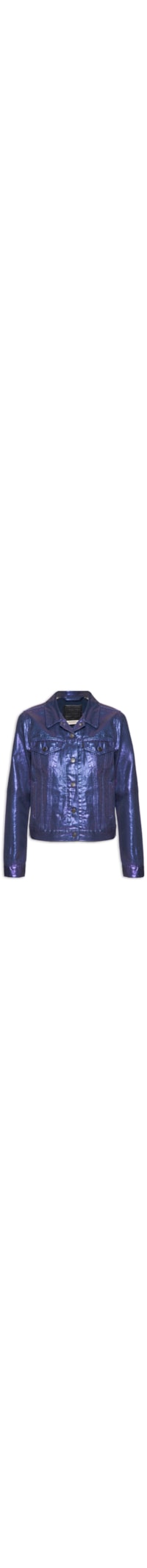 A jaqueta roxa é confeccionada em sarja com superfície metalizada e sem elasticidade. A peça solta ao corpo possui colarinho clássico, mangas longas com abotoamento nos punhos, recortes, bolsos frontais de fechamento em botão, bolsos frontais embutidos, tag da marca aplicada na parte frontal em tom contrastante, efeito furta cor e fechamento frontal em botões.