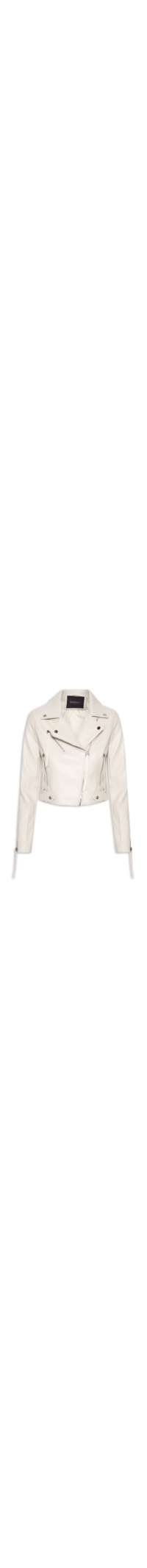A jaqueta bege é confeccionada em material sintético sem elasticidade. A peça solta ao corpo possui gola lapela chanfrada com rebites metalizados, mangas longas com zíper nos punhos, recortes posteriores, martingales e passantes aplicados na parte frontal na altura da barra, forro, bolsos frontais embutidos com fechamento por zíper com puxador, comprimento cropped* e fechamento frontal por zíper.