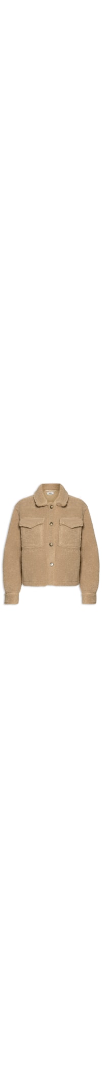 A jaqueta marrom é confeccionada em pelúcia com baixa elasticidade. A peça solta ao corpo possui colarinho simples, mangas longas com abotoamento nos punhos, ombros estendidos, recorte posterior, bolsos frontais com fechamento por aba e fechamento frontal por botões.