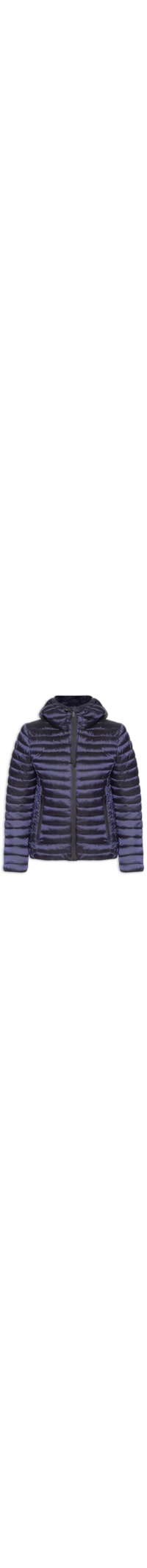 A jaqueta azul é confeccionada em tecido levemente encorpado com superfície metalizada e sem elasticidade. A peça de modelo puffer* possui gola alta, gorro regulável, mangas longas com punhos ajustados, bolsos frontais modelo faca com fechamento por zíper, barra com elástico embutido, forro em pelúcia e fechamento frontal por zíper.