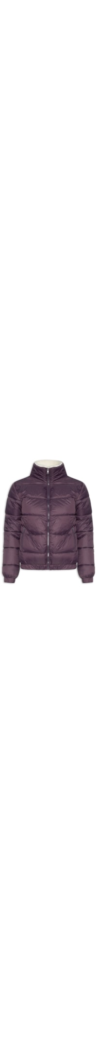 A jaqueta roxa é confeccionada em material sintético sem elasticidade. A peça de modelo puffer* solta ao corpo possui gola alta, mangas longas com ajuste nos punhos, bolsos frontais embutidos com fechamento por zíper, elástico embutido na barra, parte interna pelúcia e fechamento frontal por zíper.