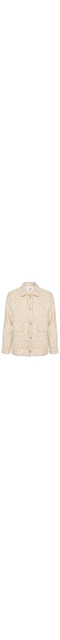 A jaqueta bege é confeccionada em tweed com fios de lurex e superfície em paetês sem elasticidade. A peça solta ao corpo possui colarinho simples, mangas longas, ombros alongados, bolsos com fechamento por abas sobrepostas, forro e fechamento frontal por botões.