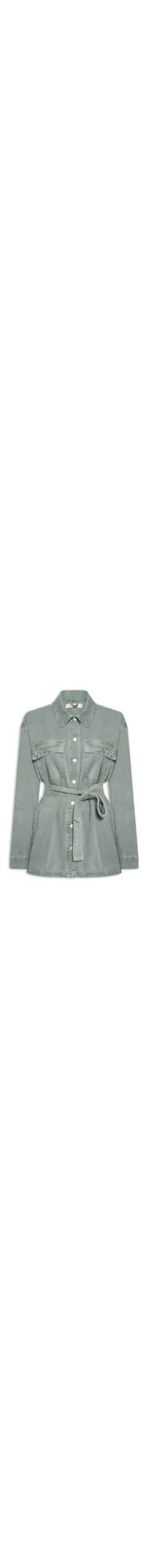 A jaqueta verdeé confeccionada em sarja sem elasticidade. A peça solta ao corpo possui colarinho clássico, mangas longas com abotoamento nos punhos, dois bolsos frontais na área do busto com fechamento por botão, dois bolsos laterais, dois passantes para cinto aplicados nas laterais, tag da marca aplicada na parte posterior em metal, e fechamento frontal por botão. Acompanha cinto em mesmo tecido para uso opcional.