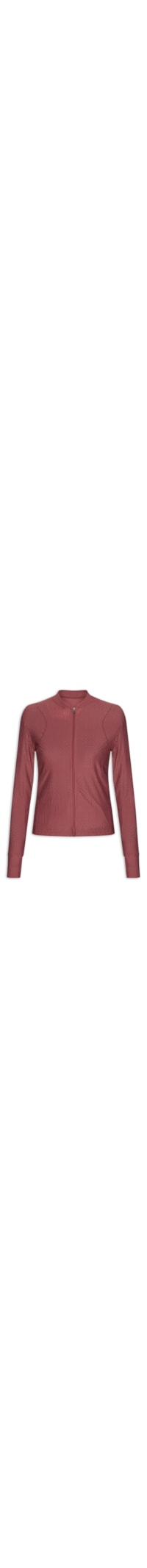 A jaqueta vinho é confeccionada em malha de poliamida com superfície texturizada e alta elasticidade. A peça justa ao corpo possui colarinho mandarim, mangas longas com recortes vazados nos punhos, leve transparência, recortes frontais e posteriores, tag da marca metalizada aplicada na parte posterior e fechamento frontal por zíper.