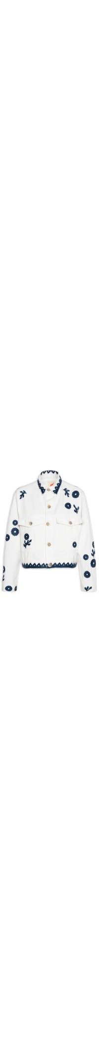 A jaqueta branca é confeccionada em sarja sem elasticidade. A peça solta ao corpo possui colarinho clássico, ombros estendidos, mangas longas com abotoamento nos punhos, bolsos frontais com fechamento por botão e aba sobreposta, recortes posteriores, aplicação de bordados florais em cor contrastante, efeito delavê e fechamento frontal por botões.