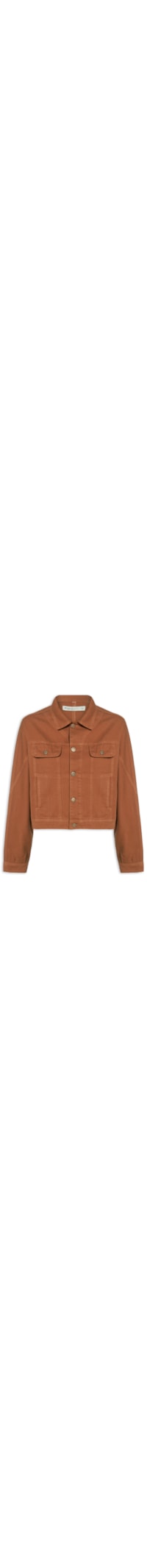 A jaqueta marrom é confeccionada em sarja sem elasticidade. A peça possui colarinho simples, mangas longas com abotoamento na parte posterior, bolsos frontais com fechamento por aba e botão, recorte posterior, recortes frontais e fechamento frontal por botões.