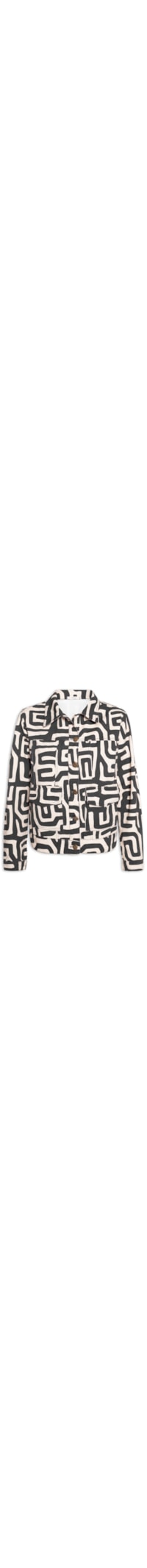 A jaqueta branca é confeccionado em sarja sem elasticidade. A peça solta ao corpo possui colarinho clássico, mangas longas com ajuste nos punhos, bolsos frontais com aba sobreposta, recortes frontais e posteriores, padronagem geométrica na cor preta e fechamento frontal por botões.