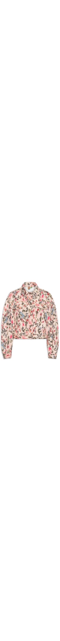 A jaqueta rosa é confeccionada em sarja sem elasticidade. A peça solta ao corpo possui colarinho simples, mangas longas com abotoamento nos punhos, bolsos frontais na altura do busto com fechamento por lapela e botões, bolsos frontais modelo faca, recortes posterior, martingale aplicado na parte posterior, estampa floral em cor contrastante, acabamento pespontado e fechamento frontal por botões.