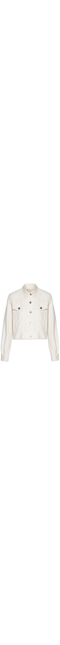 A jaqueta off white é confeccionada em sarja sem elasticidade. A peça solta ao corpo possui colarinho simples, cavas estendidas, mangas longas com detalhe de prega e abotoamento nos punhos, recorte posterior com aplicação de tag metalizada da marca, bolsos frontais com fechamento em botão, comprimento cropped* e fechamento frontal em botões.