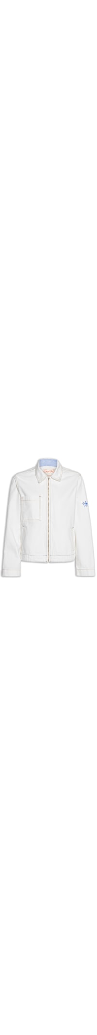 A jaqueta branca é confeccionada em sarja sem elasticidade. A peça possui gola clássica, mangas longas com punhos ajustados, ombros estruturados e caimento reto, bolso aplicado no busto, bolsos frontais embutidos, pespontos aparentes em cor contrastante, barra com acabamento simples, forro interno parcial e fechamento frontal por zíper.