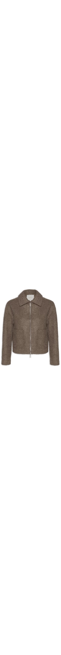 A jaqueta marrom é confeccionada em tecido encorpado com superfície texturizada sem elasticidade. A peça solta ao corpo possui colarinho clássico, mangas longas, bolsos frontais, recorte posterior, forro e fechamento frontal por zíper.