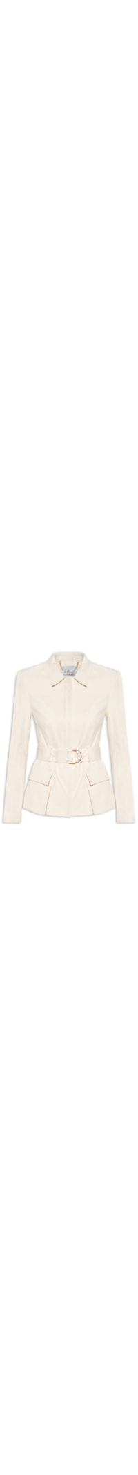 A jaqueta bege é confeccionada em sarja com baixa elasticidade. A peça solta ao corpo possui colarinho simples, mangas longas, ombreira, recorte posterior, recorte frontal, passantes aplicados na altura da cintura, bolsos frontais com fechamento por aba, forro e fechamento frontal por zíper e botões de pressão. Acompanha cinto no mesmo tecido e cor para uso opcional.