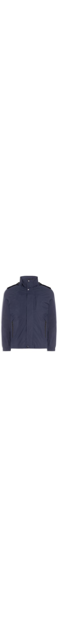 A jaqueta azul é confeccionada em tecido leve impermeável sem elasticidade. A peça de modelo 3 em 1 possui gola alta com capuz removível, mangas longas com punhos ajustados, bolsos frontais com fechamento por zíper, forro puffer preto removível, barra com elástico embutido e fechamento frontal por zíper e botão.