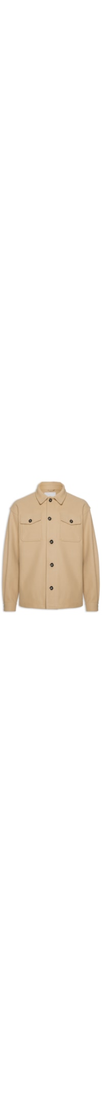 A jaqueta bege é confeccionada em tecido encorpado sem elasticidade. A peça solta ao corpo possui colarinho simples, mangas longas com abotoamento nos punhos e detalhe de pregas, recorte posterior, bolsos frontais na altura do tórax com fechamento por aba sobreposta com botão e fechamento frontal por botões.