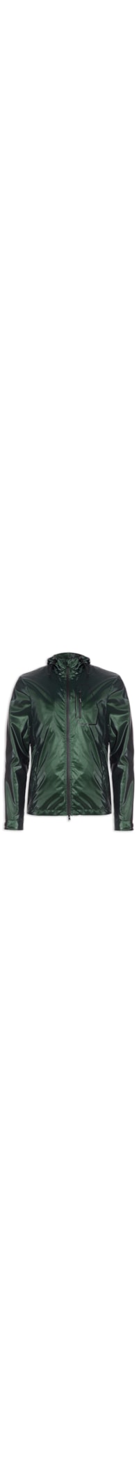 A jaqueta verde é confeccionada em tecido leve metálico com superfície metalizada sem elasticidade. A peça solta ao corpo possui capuz com elástico para ajuste, mangas longas com ajuste em velcro nos punhos, bolso na altura do tórax com fechamento em zíper com nome da marca aplicado, bolsos frontais com fechamento por botão de pressão, recortes posteriores, elástico embutido na barra com regulagem, bolso interno, forro e fechamento por zíper frontal.