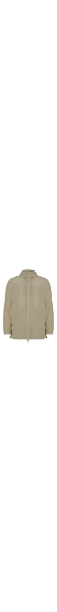 A jaqueta bege é confeccionada em tactel sem elasticidade. A peça solta ao corpo possui gola alta com capuz embutida e cordão, mangas longas com elástico embutido nos punhos, nome da marca aplicado na altura do tórax, bolsos frontais no modelo faca com fechamento em botão de pressão, elástico embutido na barra para ajuste, recorte posteiror e fechamento por zíper frontal.