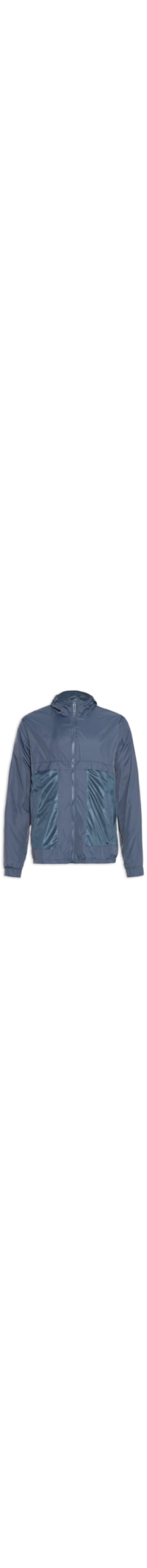 A jaqueta azul é confeccionada em nylon. A peça modelo corta vento possui, gola alta, capuz aplicado com elástico regulável embutido, mangas longas com elástico embutido nos punhos, recorte frontal sobreposto na altura da cintura, recorte frontal em tela com bolsos embutidos, forro em tela, shape solto e fechamento frontal por zíper.